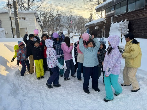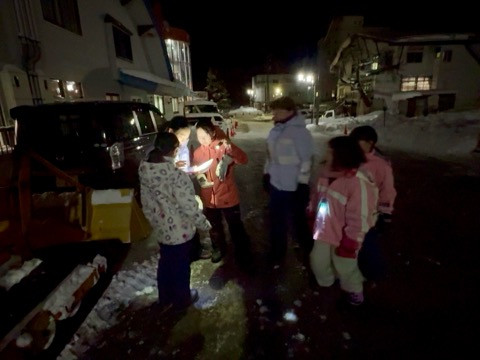 夕食後の夜のプログラムは、お宿周辺でスキーグループ対抗のポイントラリー。