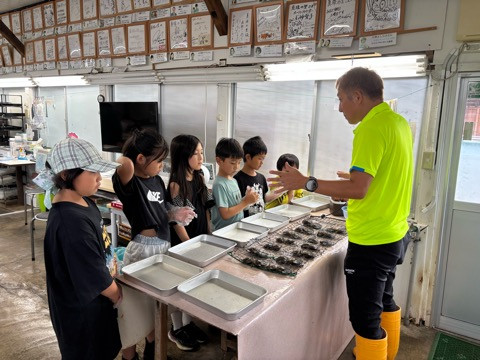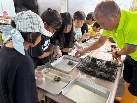 生きたアコヤ貝のどこに真珠があるのか説明を聞きながら、実際に取り出してみます。