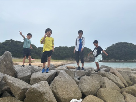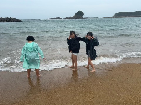 体験後は近くの「あづり浜」へ移動。あいにくの天気で波が高く海には入れませんでしたが、波打ち際で水遊びをすることができました。